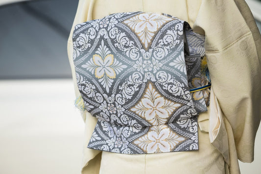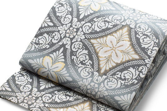 Online限定【作楽の八寸名古屋帯(アリス英字】紹巴織(ライトグレー・全通仕様)