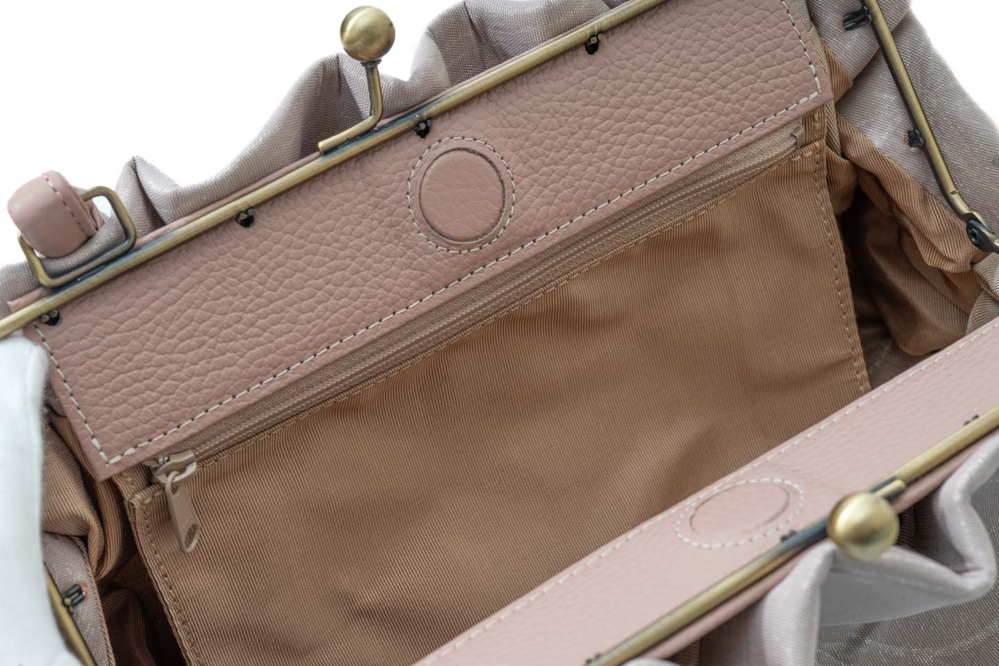 可愛らしく優しい感じの雰囲気を損なわないように、開口部の大きながま口の口金は別注で制作。