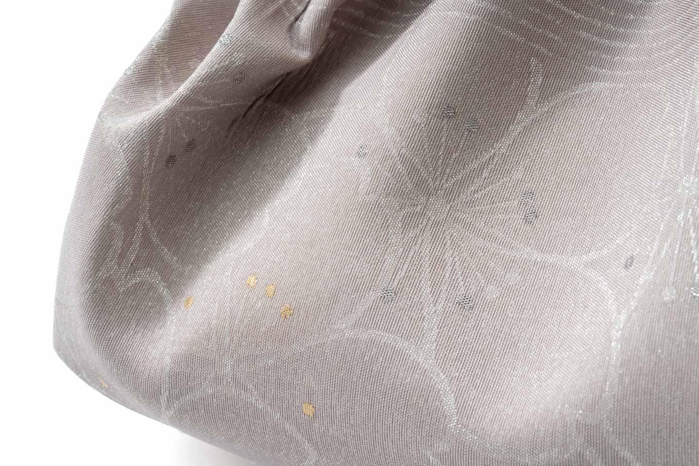 ふわふわとしたドレープと質感をつくり出すため、見た目からは想像できない長さの帯地を使用しており、その織物(意匠や配色)ごとの特長を活かしてバッグにしています。