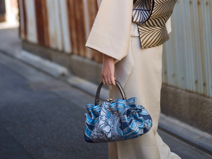 絹織物『帯』をつかって制作するおしゃれバッグです。その特長は美しい質感と光沢、そして意匠にあります。