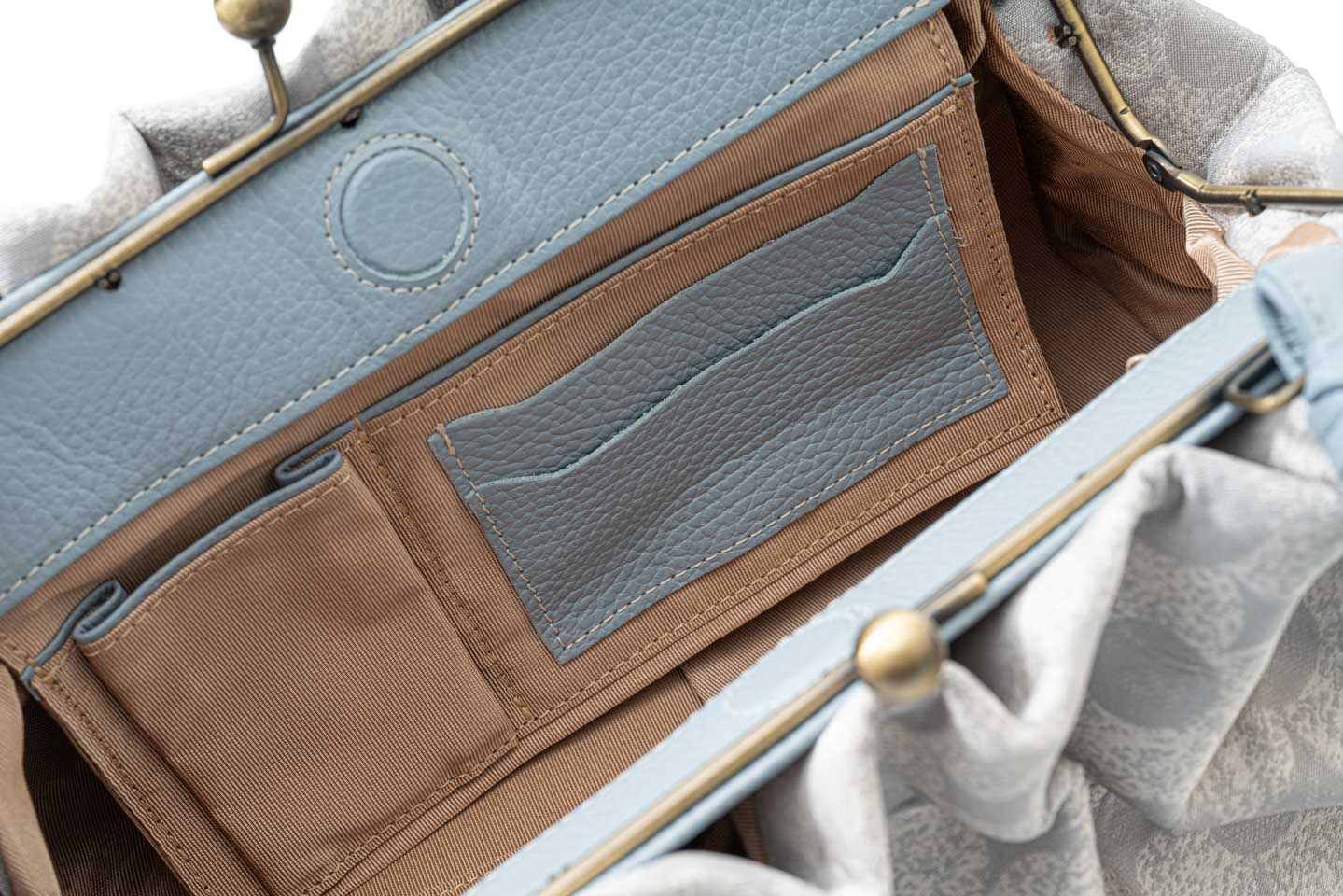 また持ち手の革部分は、帯締めや帯揚げをコーディネートするように帯地との相性を考慮して配色しています。