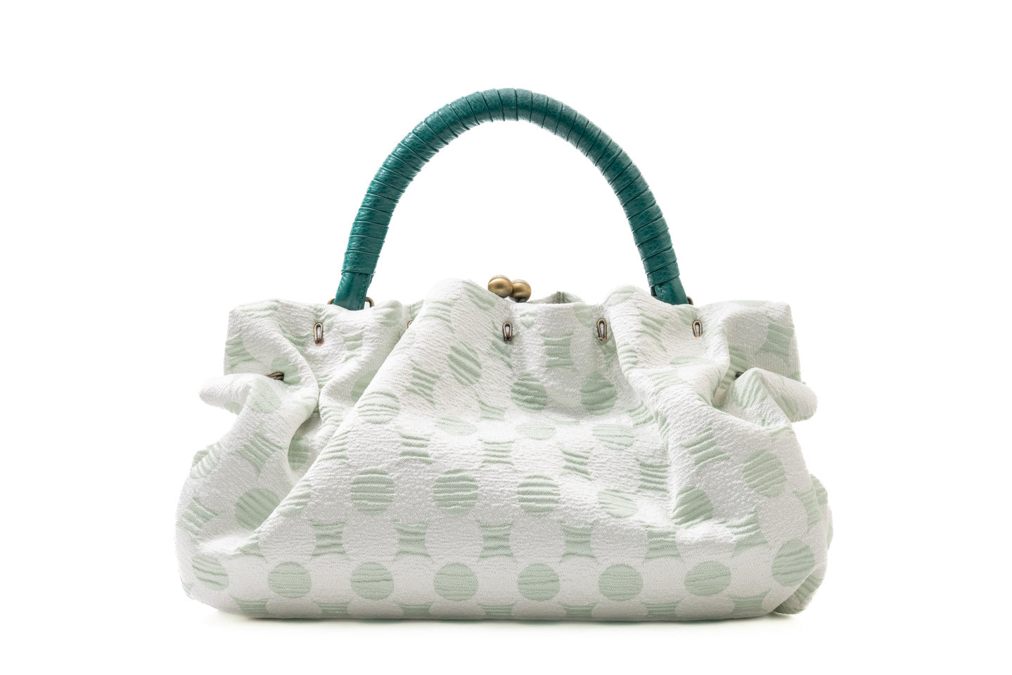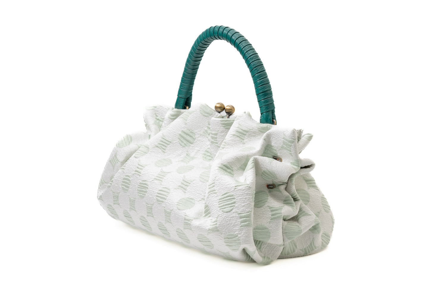 ふわふわとしたドレープと質感をつくり出すため、見た目からは想像できない長さの帯地を使用しており、その織物(意匠や配色)ごとの特長を活かしてバッグにしています。