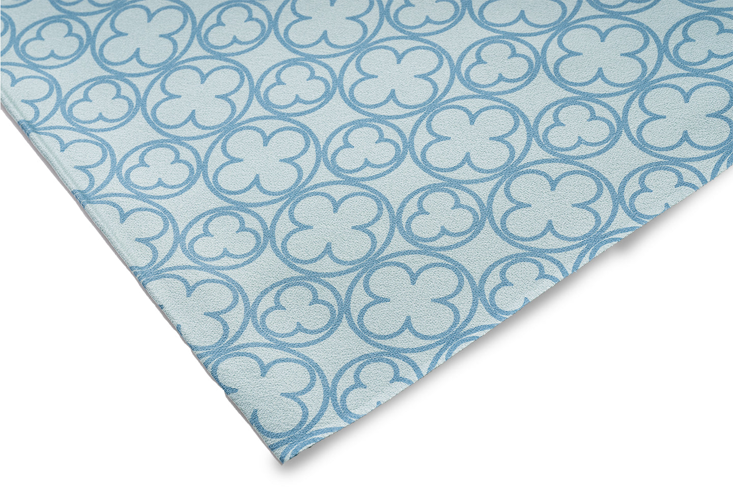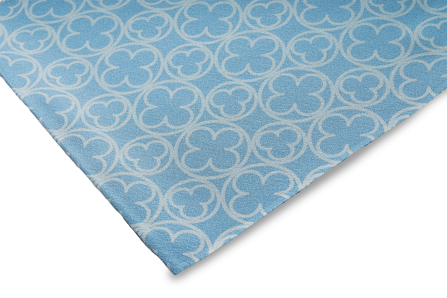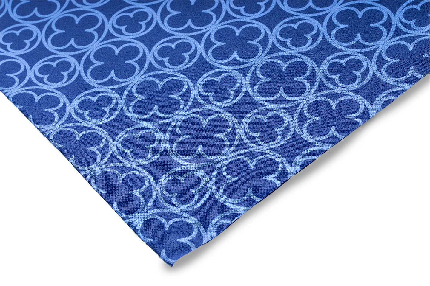 帯揚げのデザインは、帯地のデザインを元に制作する作楽シリーズの『三葉四葉』柄。この柄はヨーロッパ建築をモチーフに、七宝繋ぎなどの古典文様をイメージしてデザインした文様になります。