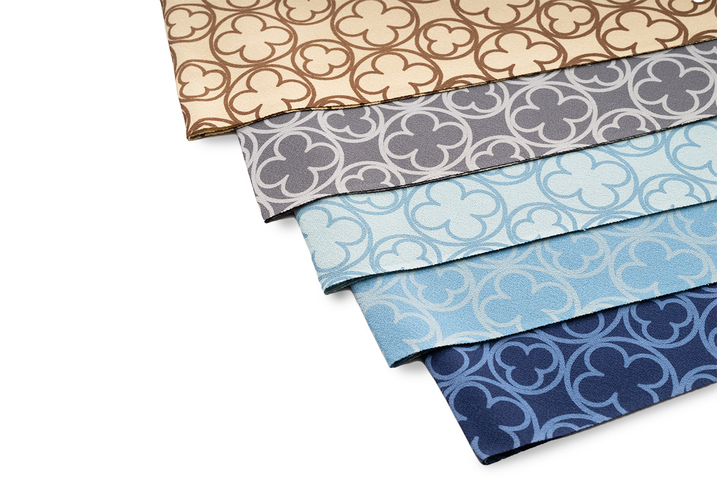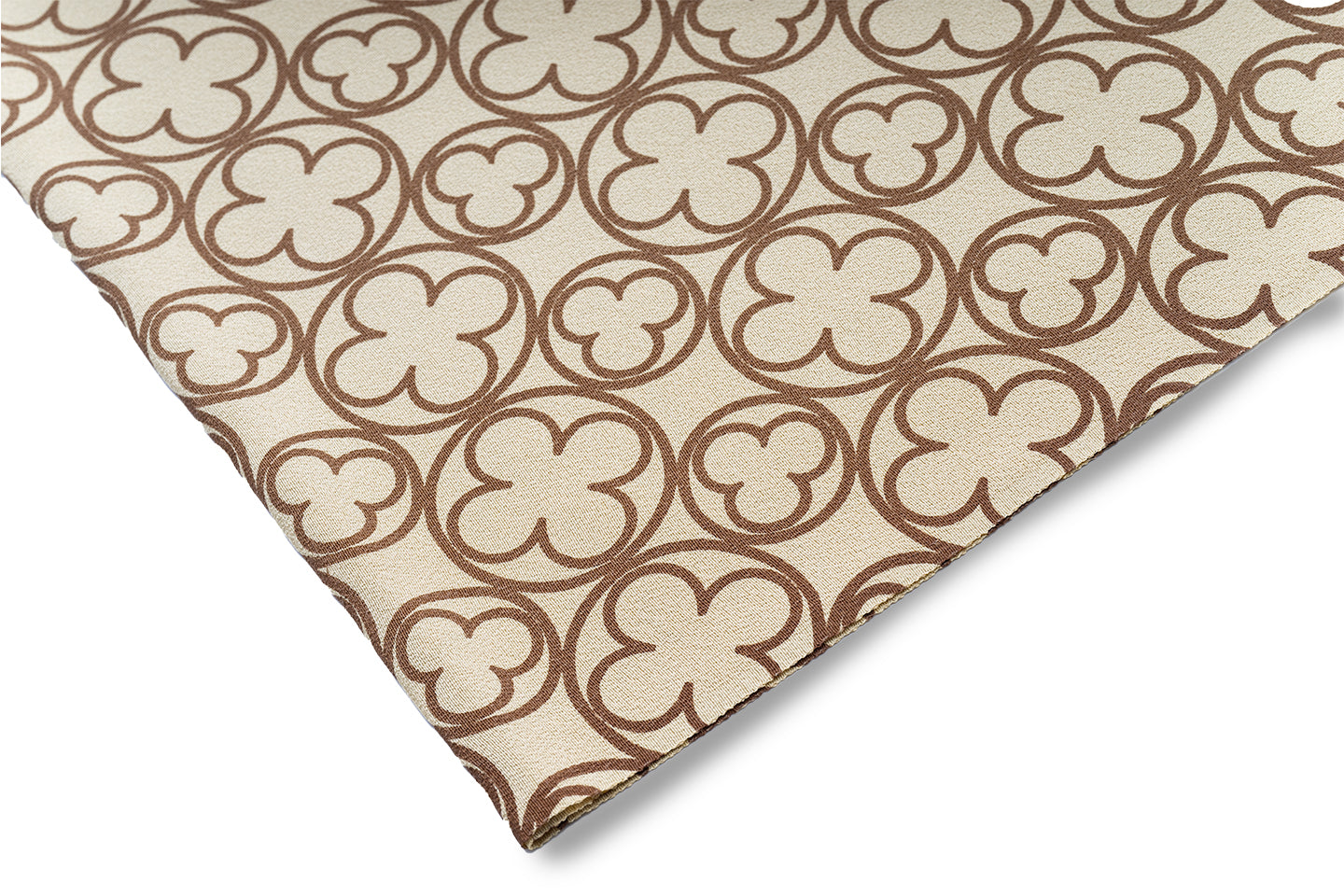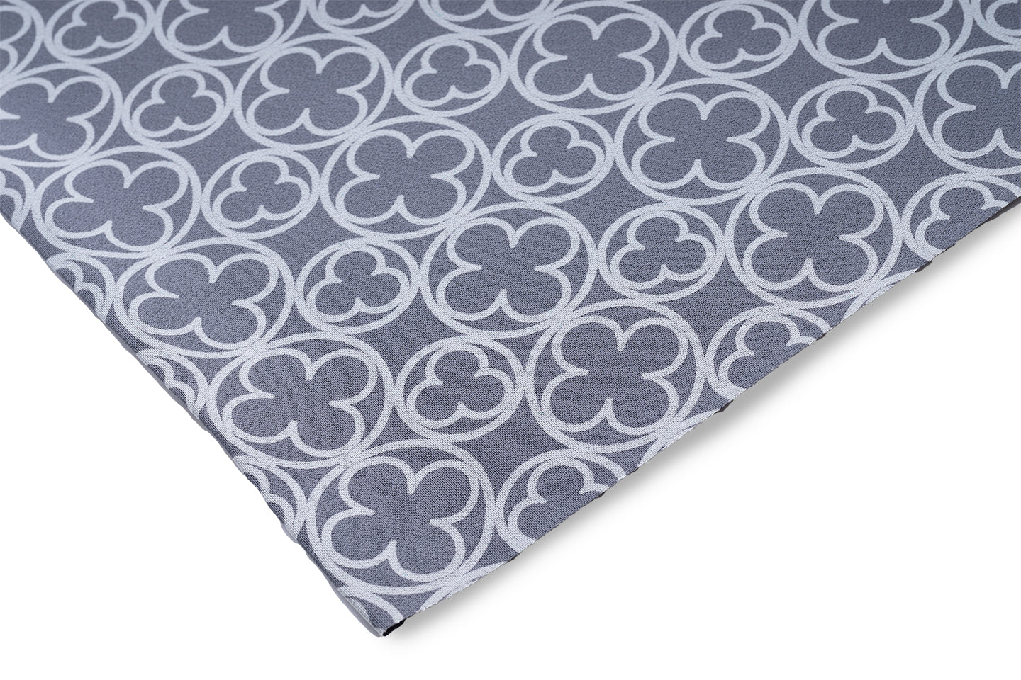 帯揚げのデザインは、帯地のデザインを元に制作する作楽シリーズの『三葉四葉』柄。この柄はヨーロッパ建築をモチーフに、七宝繋ぎなどの古典文様をイメージしてデザインした文様になります。
