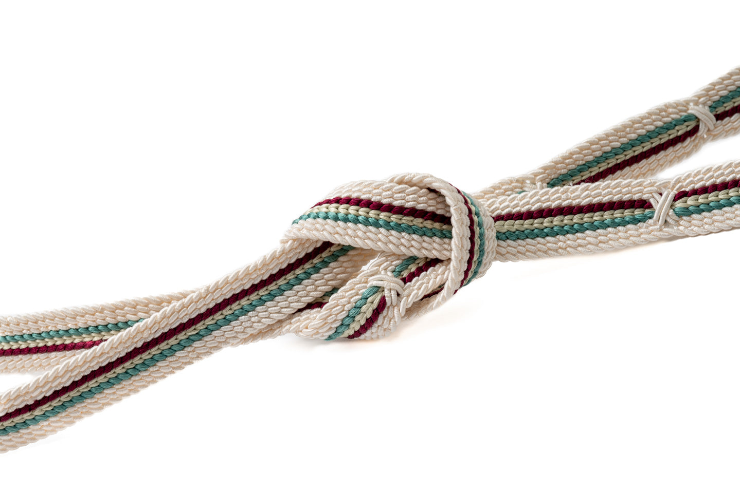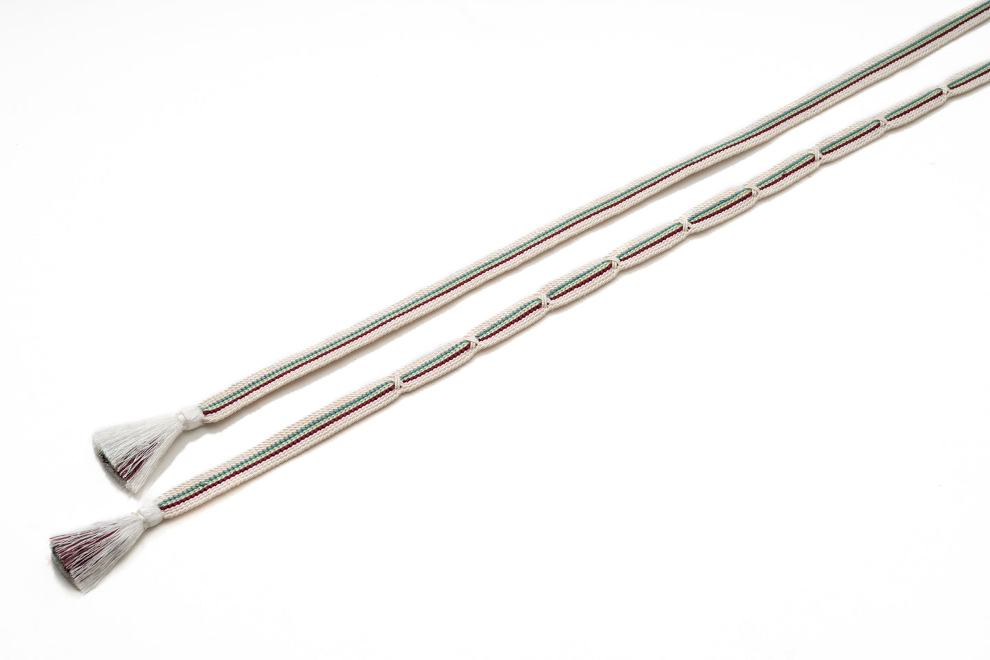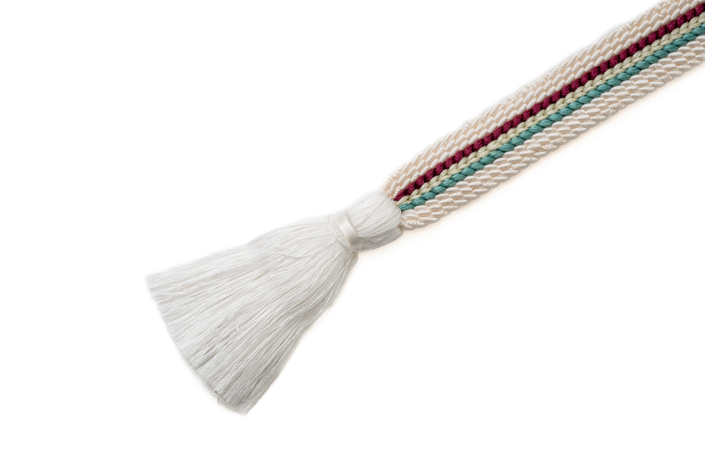生成りをベースにエンジ、青磁色といったアクセントカラーが映える上品ながらも華やかな配色の帯締めです