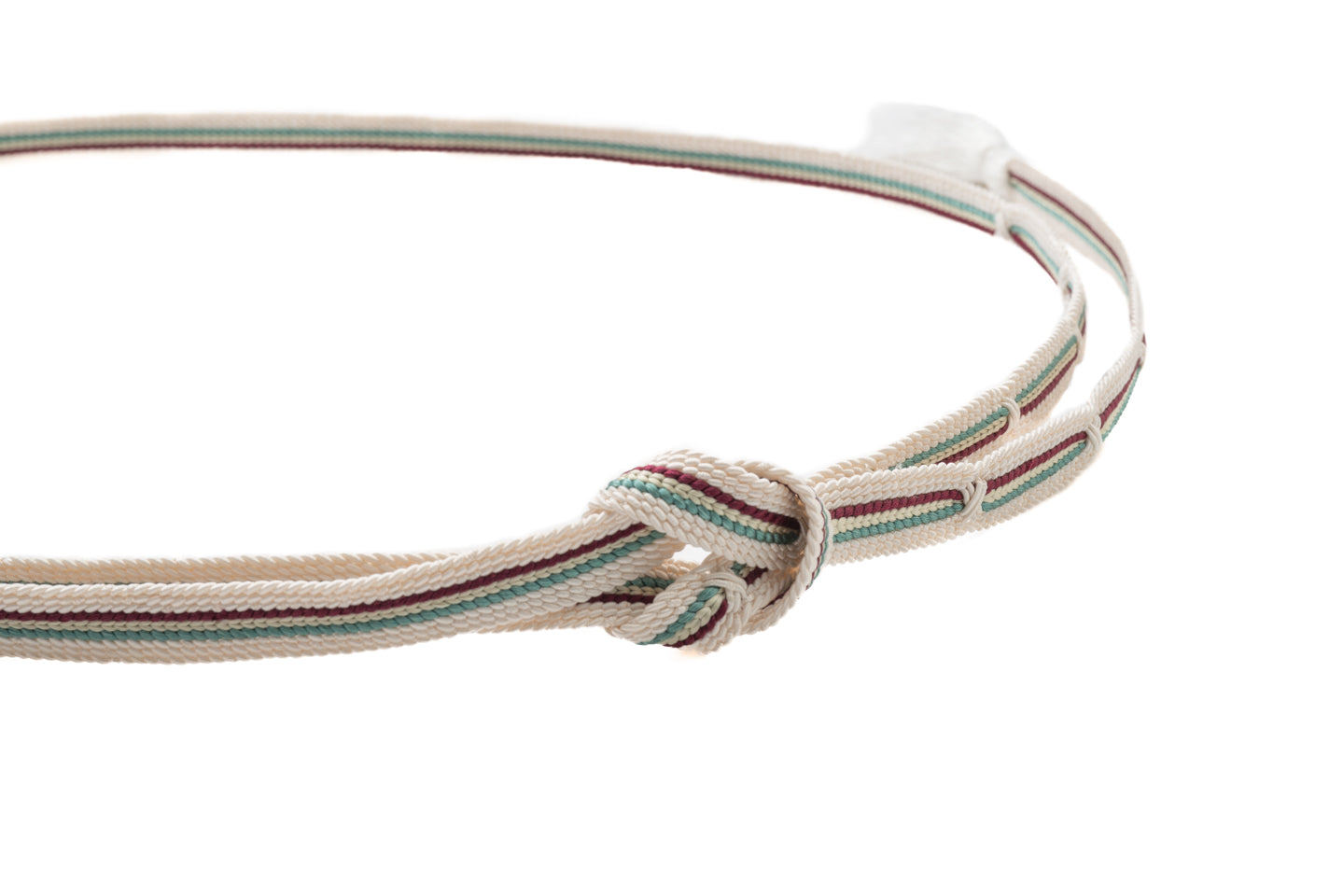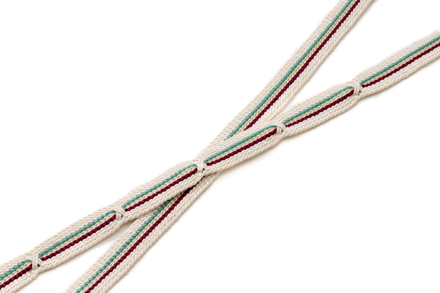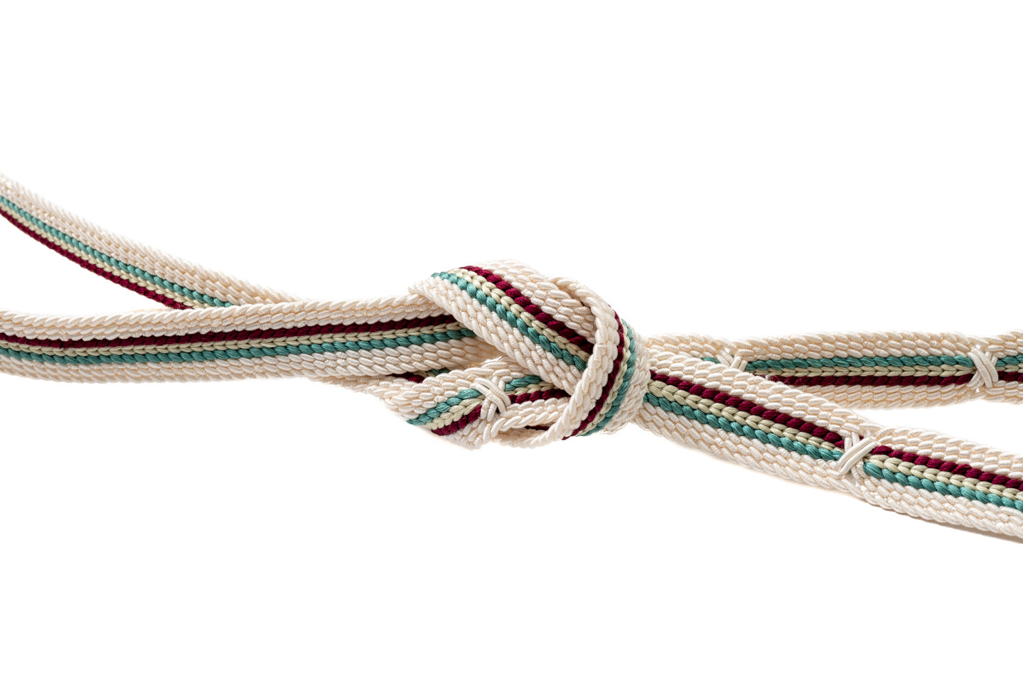 生成りをベースにエンジ、青磁色といったアクセントカラーが映える上品ながらも華やかな配色の帯締めです