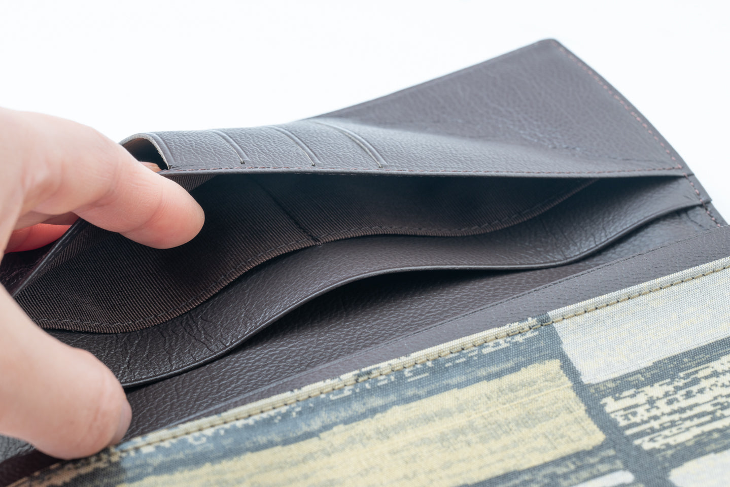 素材の『絹』は、風合いや発色において他の繊維と比べ美しいものです。このお財布は汚れや水分から帯地を守るため、特殊なコーティングを施しています。