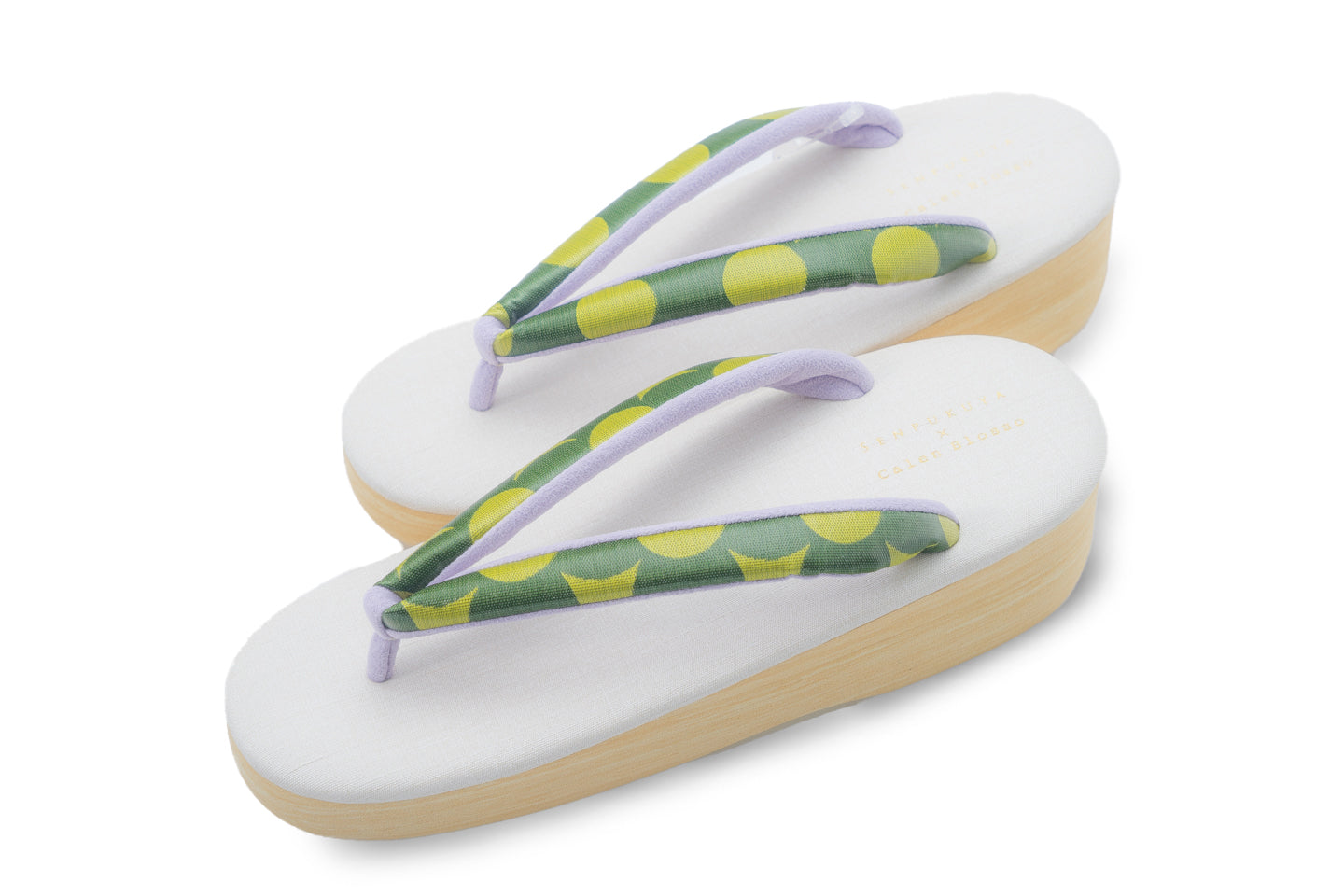 また、花緒には京都で400年続く唐紙の老舗『唐長』の南蛮七宝文様を織りで表現した帯地を使用しております。