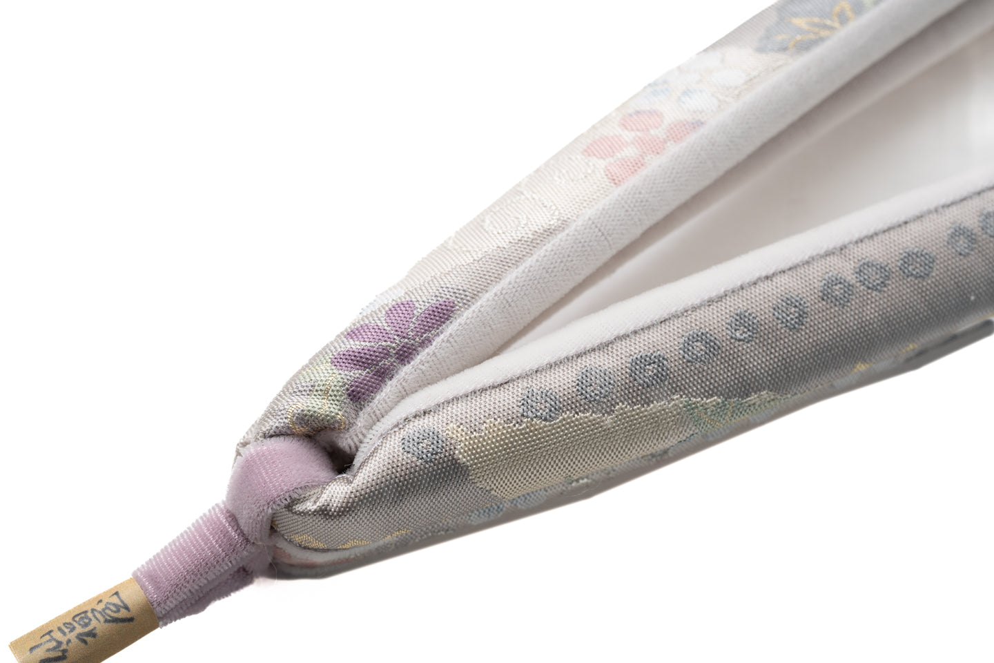 使用する帯地は『紹巴織』。経糸を覆い隠すように、緻密に横糸を打ち込み織り成す織物。大変細密な表現が可能で、絹の特色でもある、光沢・発色、しっとりとした質感が大きな特長です。