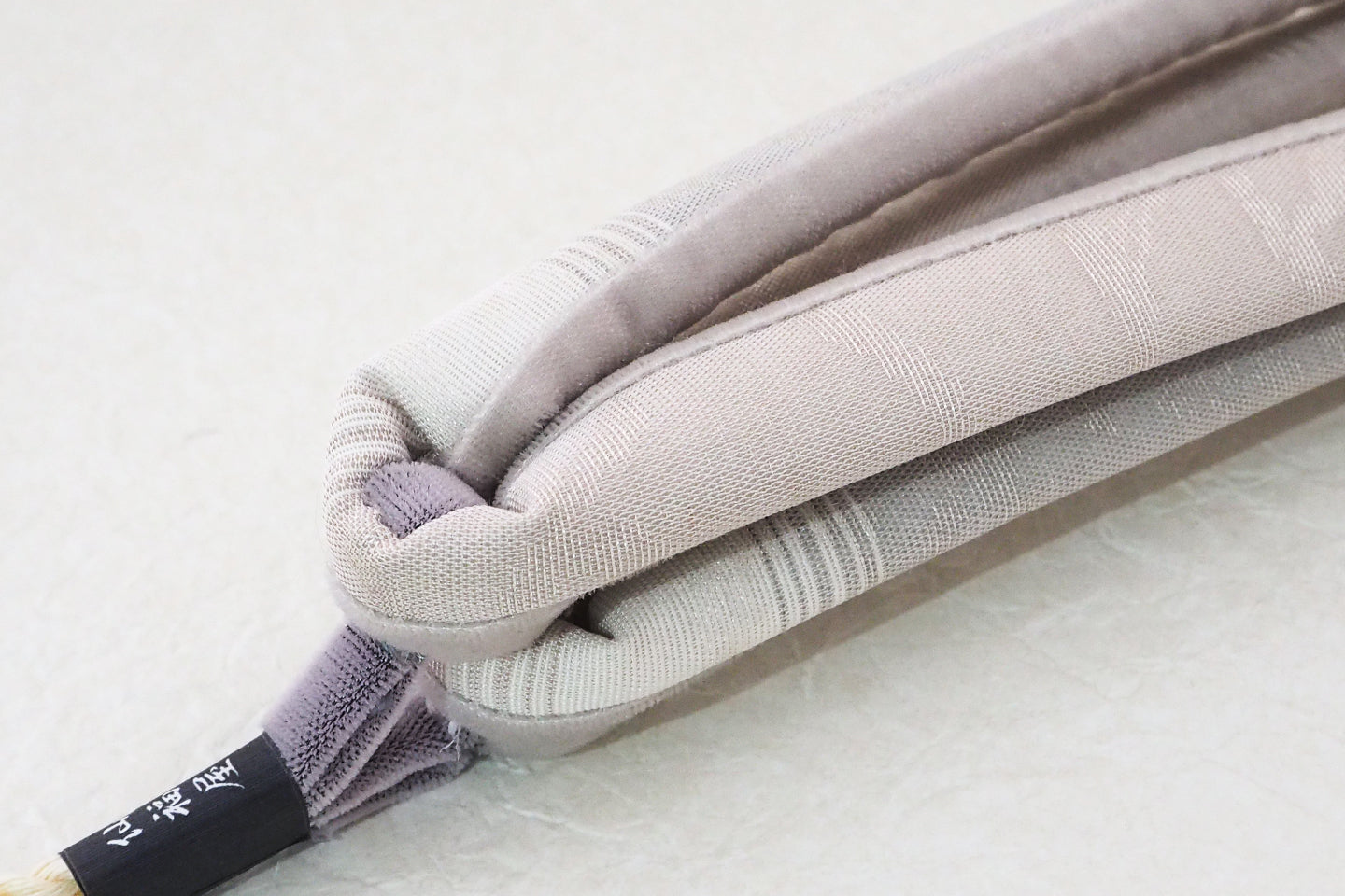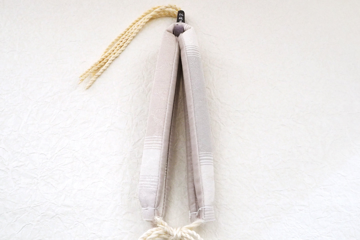 となみ織物の帯地をつかって制作した花緒。オールシーズン結べる総紗縫の帯地で製作した、横段のつぼ通し花緒です。