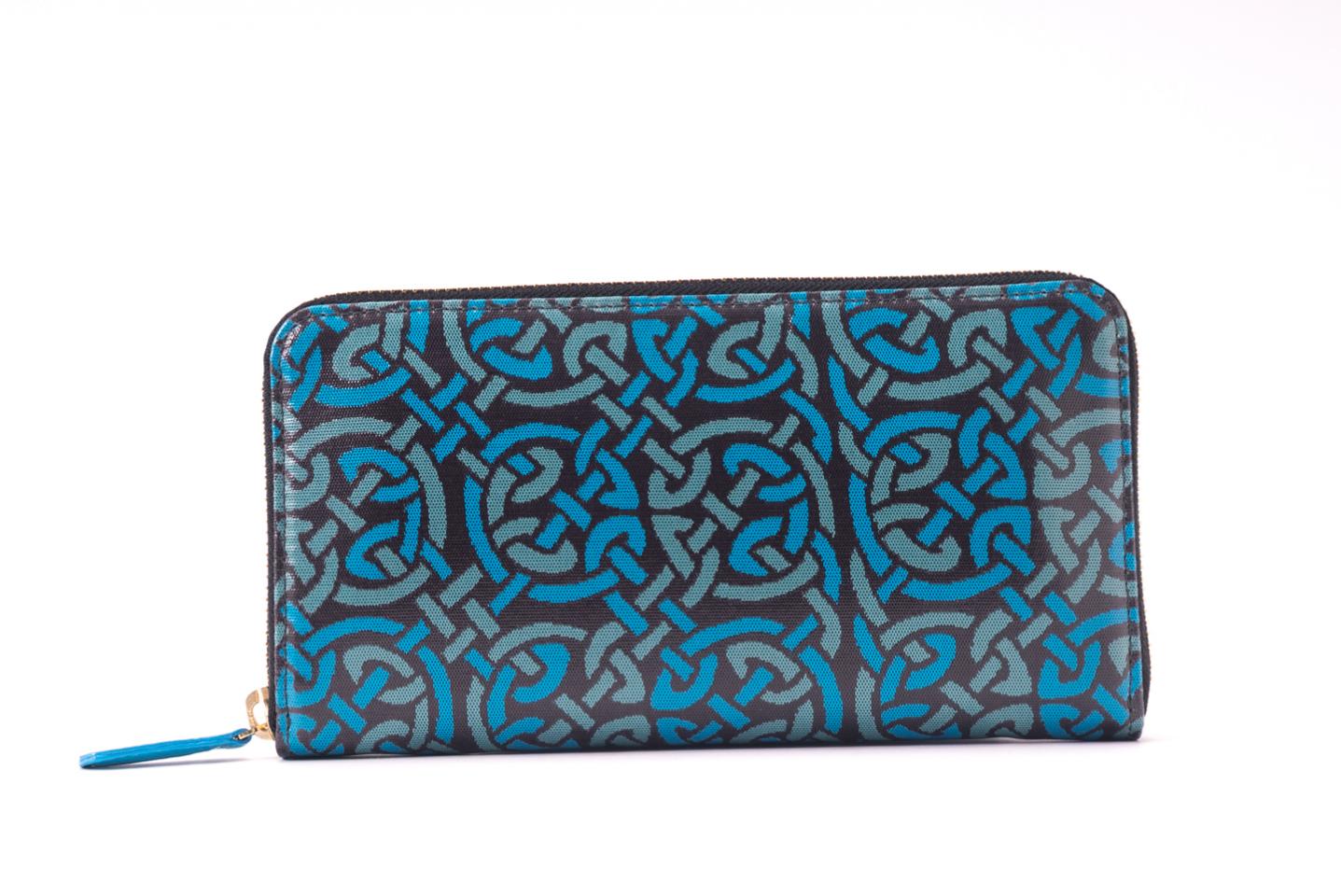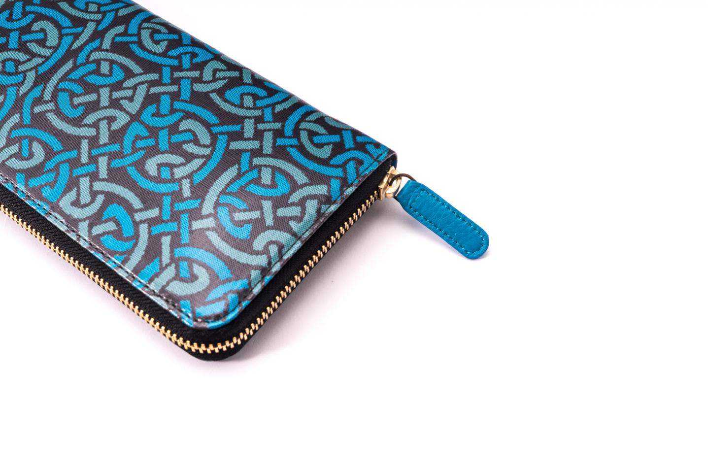 このお財布の意匠には、アイルランドなどに古くから伝わるケルト装飾文様を織りで表現したもの。文字を持たなかったケルト人にとって非常に大切にされたデザインで、魔除けの意味を持っています。普遍的な意匠は千数百年経った今でも、根強い人気を誇っております。