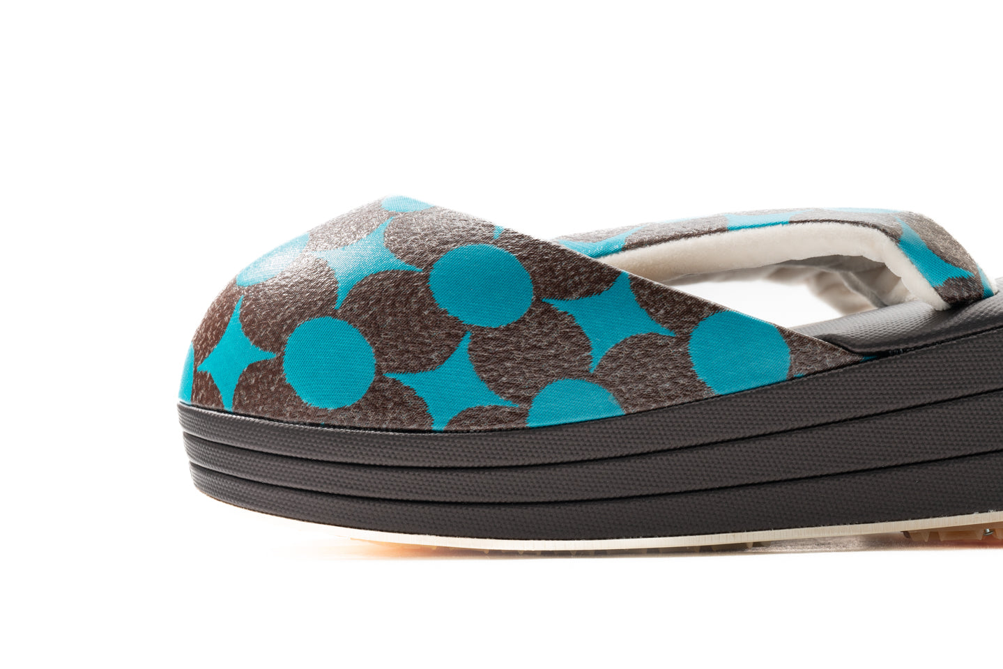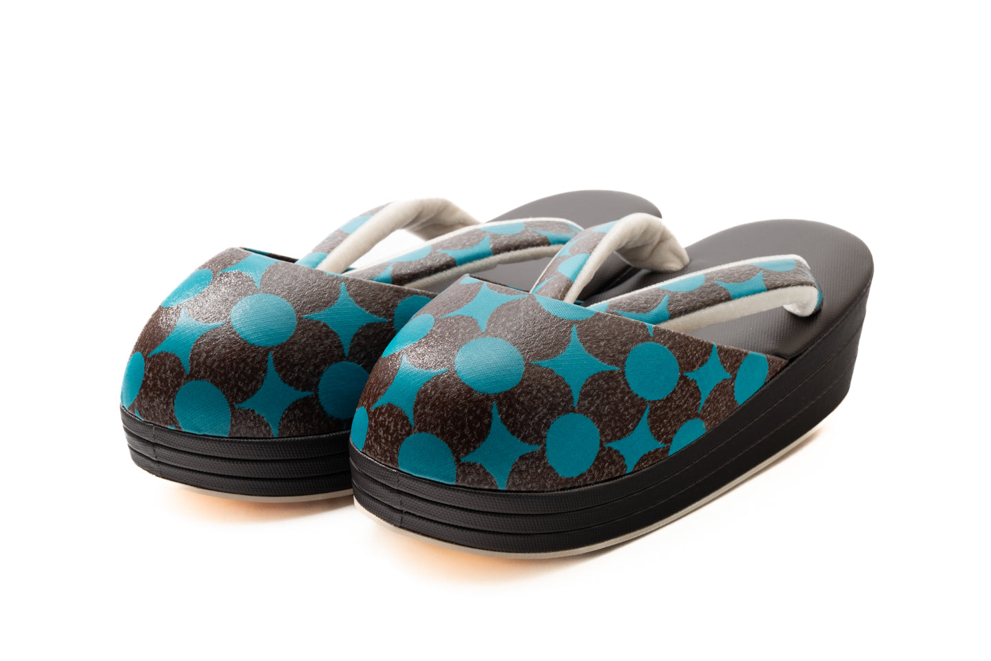 今回の防寒雨草履に使用する帯地には、カバーと花緒の両方に『南蛮七宝文様』を使用。